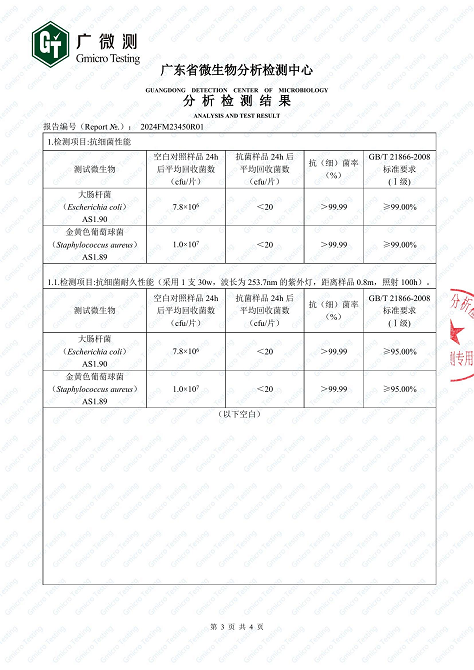 《 经检测, 对大肠杆菌、金黄色葡萄球菌的抗(细)菌率>99.99%;耐久抗(细)菌率为>99.99%》